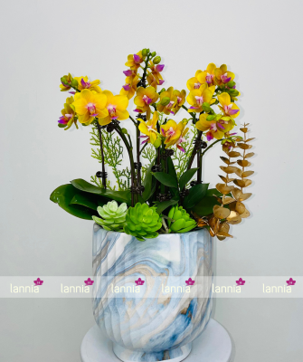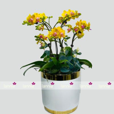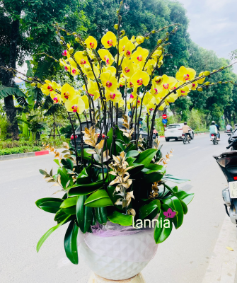 Lan Hồ Điệp Vàng được ưa chuộng nhất trong mỗi dịp Tết. Bởi lẽ sắc vàng ấm áp tượng trưng cho mùa xuân và năm mới đang gõ cửa. Màu vàng cũng là màu của sự giàu sang, thịnh vượng, tài lộc. Chính vì thế chậu Lan Hồ Điệp vàng là lựa chọn quá tuyệt vời.